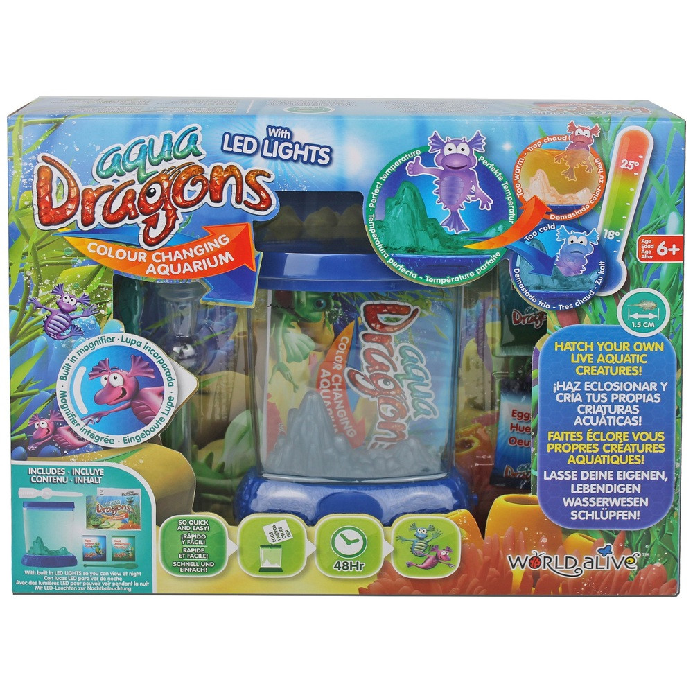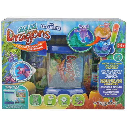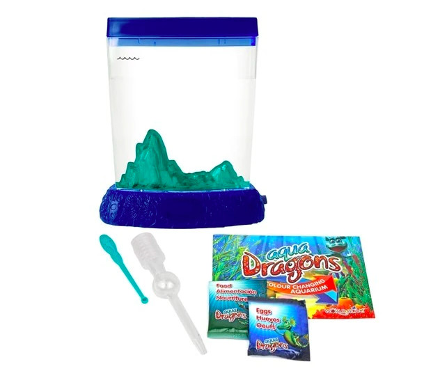 Az Aqua Dragons Vízalatti Élővilág készlettel dinoszaurusz-korabeli házi kedvenceket tarthatsz. A csomag tartalmaz alvó rákokat, amelyek víz hatására életre kelnek és gyorsan fejlődnek. A sárkányokra emlékeztető állatok akár 2 cm-re is megnőhetnek, boldogan úszkálva a vízben. Könnyen gondozhatók, és több generációjuk is felnevelhető, ahogy figyeled fejlődésüket, táplálkozásukat és játékukat. A rákok gondozása növeli a felelősségérzetet, és különleges élő szobadekorációt nyújt. A csomag tartalma: